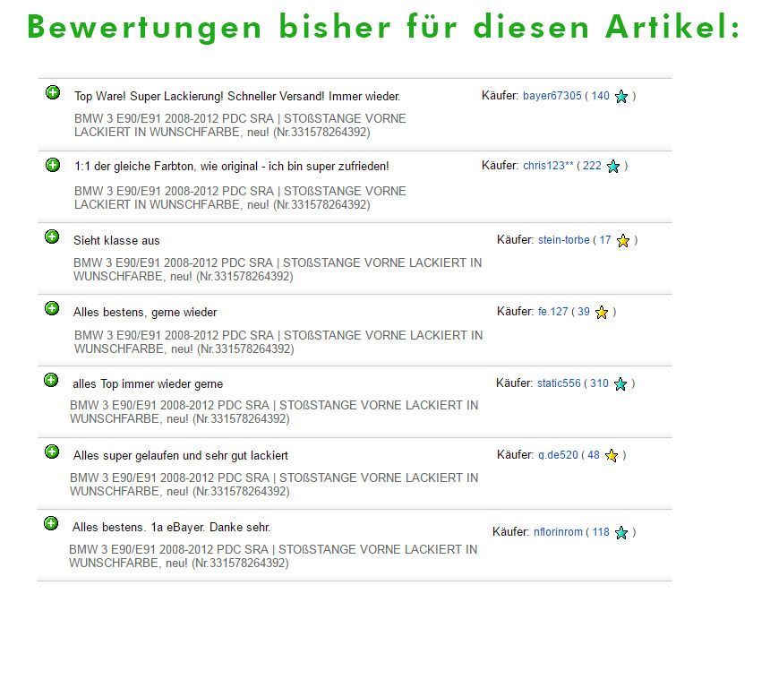 Neuteil, lackiert vom Fachmann in einer Fachwerkstatt in Ihrer Wunschfarbe. Die von uns angebotenen Stoßstangen sind Nachbauteile in höchster Qualität, die den Originalteilen in Passform und Material entsprechen (sehr gute Passgenauigkeit, einfache Montage an originalen Befestigungspunkten).
